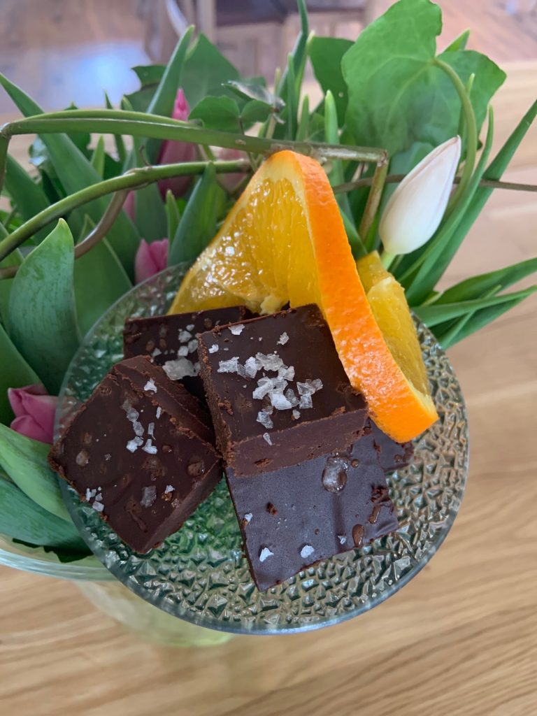 Chokladtryffel med touch av apelsin 1 dl vispgrädde 50 gr smör 300 gr mörk choklad 1 dl kesella Rivet skal av ½ apelsin 1 tsk flingsalt Gör såhär: Koka upp grädde och smör i en kastrull. Ta bort kastrullen från värmen Bryt chokladen och låt smälta i gräddsmöret Rör i kvarg och apelsinskal Häll […]
